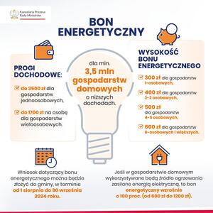 Gminny Ośrodek Pomocy Społecznej w Dobrzycy informuje, że od 01 sierpnia 2024 r. do 30 września 2024 r. można składać wnioski na bon energetyczny na rok 2024 - dla każdego gospodarstwa domowego wieloosobowego (którego dochód na osobę netto nie przekracza kwoty 1700 zł) lub jednoosobowego (jeśli dochód na osobę netto nie przekracza kwoty 2500 zł) w 2023 roku.